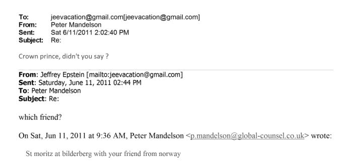 But an email exchange between the disgraced Lord Mandelson and Epstein about the Bilderberg meeting in S:t Moritz in 2011 also reveals a friendship with Crown Prince Haakon (YGL 2005).6