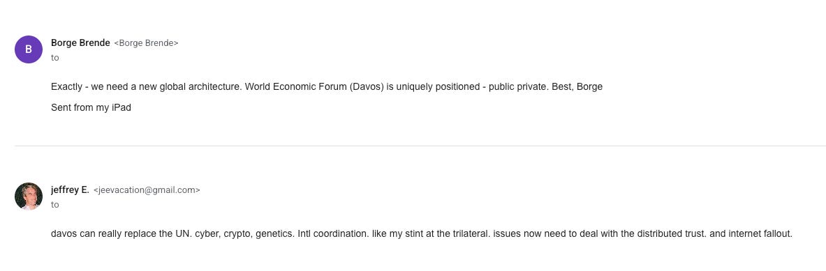 As reported by Politico and other mainstream media outlets, On September 16, 2018, Jeffrey Epstein wrote in an email to WEF President Börge Brende that, “Davos can really replace the UN. C21, cyber, crypto . genetics. .. intl coordination.” upon which Brende answered, “Exactly - we need a new global architecture. World Economic Forum (Davos) is uniquely positioned - public private.”